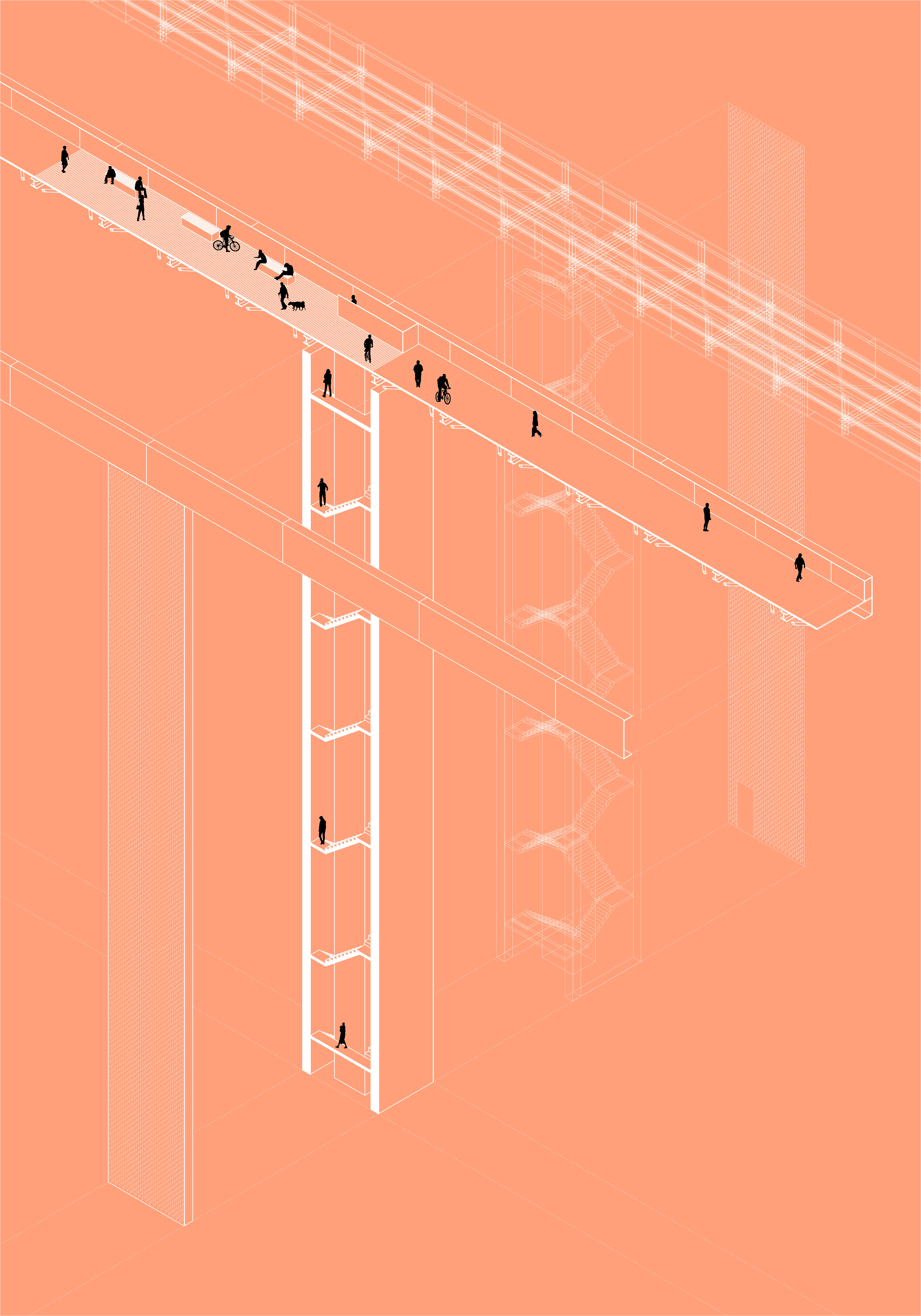 My work is represented by many different collages which express the way how I began to search the final form of the bridge. The form was mainly based on how should people perceive the space 40 meters above the ground while crossing from one to another side.